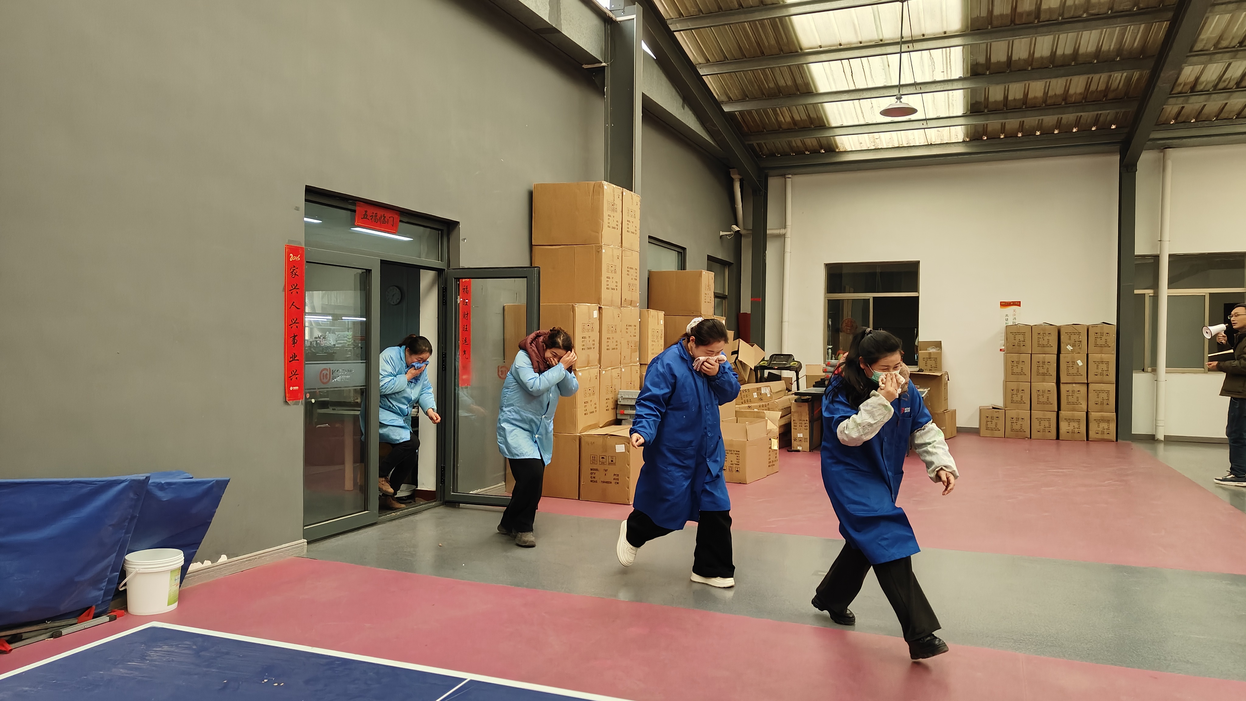隨著演練指令下達(dá),各部門迅速組織疏散,組織員工彎腰捂鼻、低姿前行,